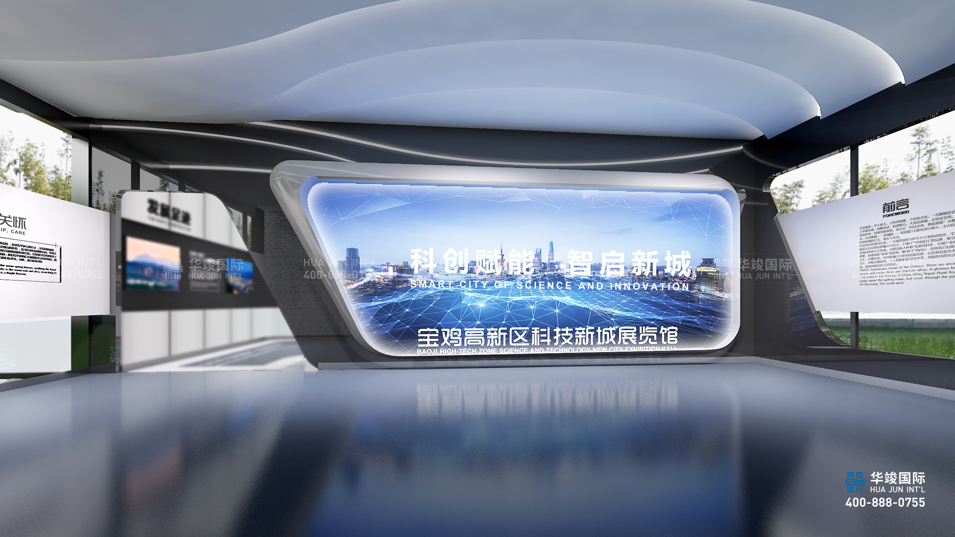 寶雞高新區城市館展廳設計項目由華竣數創執行整體設計施工。華竣國際以“智慧城市展廳”為起點,結合數字沙盤、數字影院、虛擬現實、互動多媒體等技術,打造承載城市歷史、展現城市現在、展望城市未來的智慧規劃館。