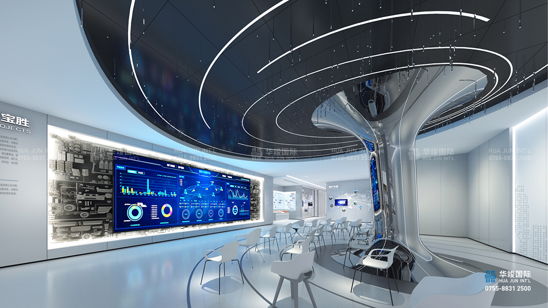 寶勝科技園區展館設計項目是由華竣出品的優秀作品,華竣以創新的智慧展廳設計理念,融合互聯網+思維,順應科技化趨勢,結合互動多媒體、數字影片、數字沙盤、虛擬現實等科技展項,打造震撼視覺的高品質科技展廳。