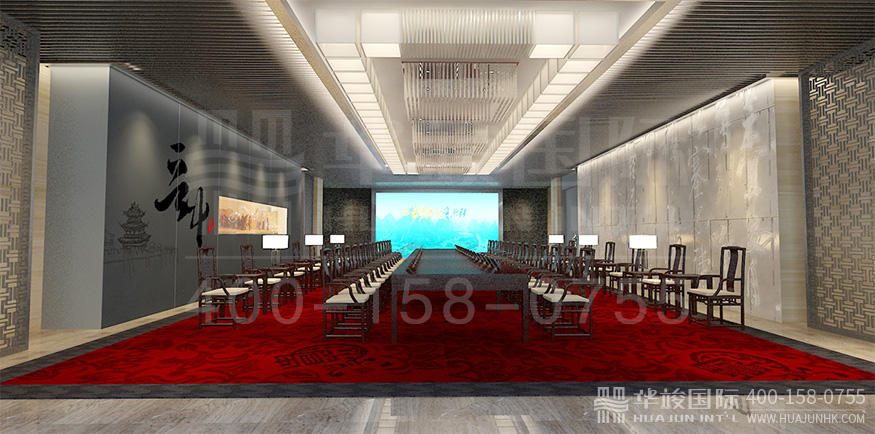 序廳頂部,采用LED矩陣燈組合成文字,以科技新穎的方式呈現(xiàn)公司主題理念。背景墻下以高低錯(cuò)落的LED屏,滾動(dòng)播放集團(tuán)文化。整個(gè)序廳虛實(shí)結(jié)合,古今交融,四圍采用傳統(tǒng)中式風(fēng)格,天地融合現(xiàn)代科技手段,整體格局相輔相成,渾然一體。