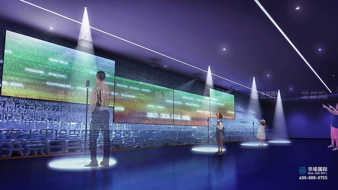 以 “聽(tīng)覺(jué)、視覺(jué)”相結(jié)合,營(yíng)造不一樣的觀展感受,詩(shī)詞的平仄、詩(shī)樂(lè)一體 ,賦予文字動(dòng)畫(huà)之美。將古代的詩(shī)句河字本身的含義相結(jié)合,借用全息互動(dòng)投影手段,生成具有半獨(dú)立空間的立體圖形,在無(wú)限循環(huán)中傳達(dá)漢語(yǔ)之美的理念。