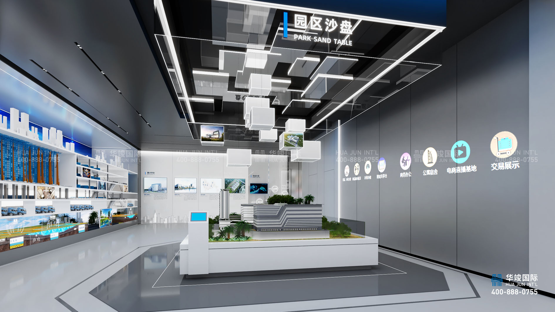 數智賦能 通達無限:展區第二大空間,中心點匯聚園區實體沙盤,打造醒目視覺核心,形成了極具凝聚力的中導空間,使各分區既相互獨立又串聯一體,增加參觀動線的多樣性,形成開放包容的姿態向四面八方自然延展。