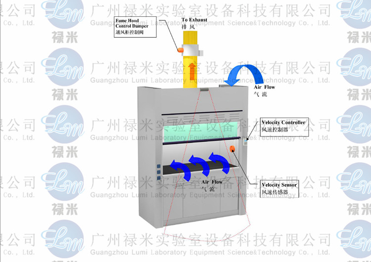 再一種就是變風量控制式的通風柜。普通的定風量系統需要人工調整固定葉片的風閥,調節通風柜的排風量,當調節閥門到某一角度時達到希望的面風速。變風量控制是通過調節閥門的傳感器改變風量達到給定的面風速,當然標準式成本低,變風量成本高,適用于要求精度高的場合。