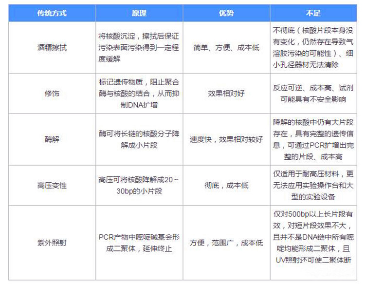雖然這些污染對PCR實驗結果的影響已經受到了廣泛重視,多數實驗室對污染控制都采取了各種辦法,比如定期大掃除清理、劃分操作區域、試劑分裝、操作謹慎、重復實驗、多角度驗證結果。但是微量的核酸片段就能被擴增,所以對污染物的控制不僅僅是做到這些就能夠杜絕和避免的,關鍵是需要從源頭控制。目前多數生物試驗室,分子實驗每天都在大規模進行,污染源已經無處不在,特異性的,非特異性的,同源的,非同源的,廣泛分布在樣本容器、實驗室臺面,試劑溶液中、儀器表面內管附著等等,你以為普通的清理就能解決這些污染源嗎?必須是不行的,實驗室大拿們都為了清除這些污染源研究出好多種方法,整理跟大家共享。