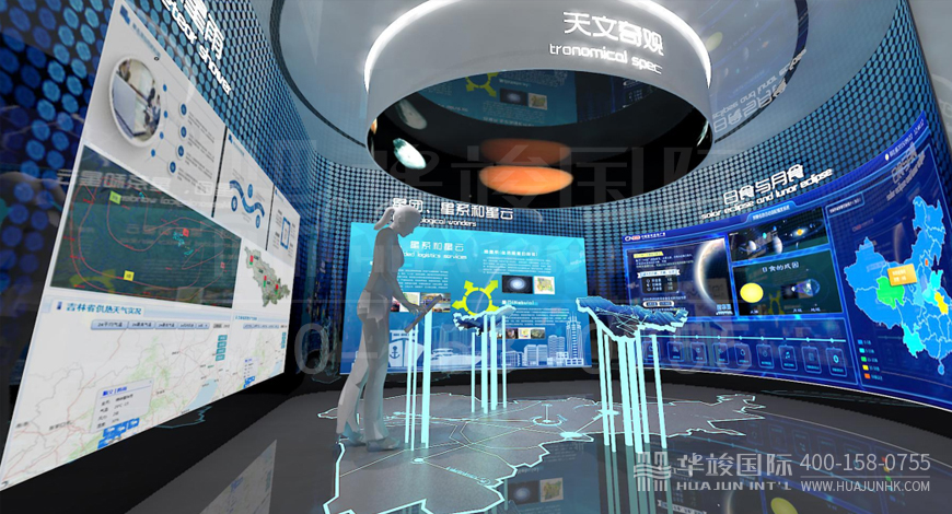 在天文奇觀展項,華竣國際以像素點為元素、融合多媒體互動屏,生動的展示各種天文現象發展與由來,同時通過互動交互軟件綜合展示宇宙的奇幻及科技的進步,旨在凸顯天文觀測對智慧氣象建設所帶來的巨大改變。