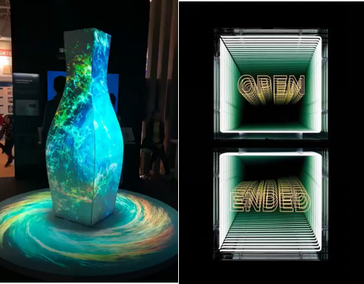 全息成像:采用投影儀或其他顯示方法,將光源折射45度成像在幻影成像膜上,稱之為全息投影。該技術可以使立體影像不借助任何屏幕或介質而直接懸浮在設備外的自由空間,可以實現270°或者360°任意角度看都是三維影像展現效果,觀眾的視線能從錐形空間里看到自由漂浮的圖像。