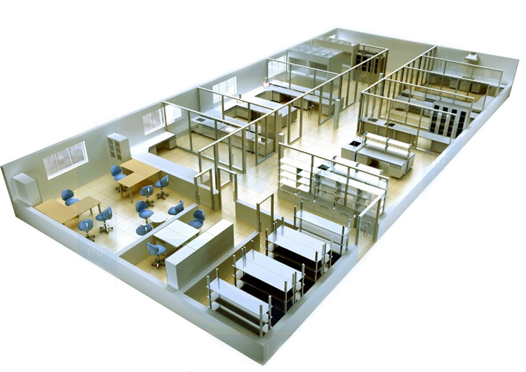 分區:A、1000級實驗室2間;B、100級實驗室1間