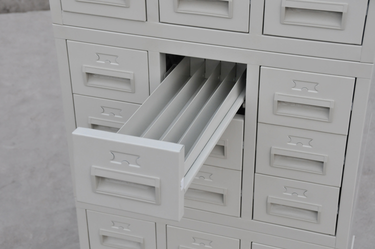 柜體采用1.0mm寶鋼冷軋鋼板。抽屜自動歸位功能,每套4組合,每組合9個抽屜,共36個抽屜,約放切片5.5~6萬片。柜體經防銹處理,靜電噴塑工藝,整體美觀大方。最新利用槽式滑輪,起始點配高強度滑輪,抽屜推拉順暢,同時防止抽屜拉出來過長造成意外跌落。另配高彈性減震墊,可使抽屜關閉時減輕與柜體的碰撞,同時使噪音減少至最低限度。玻片柜